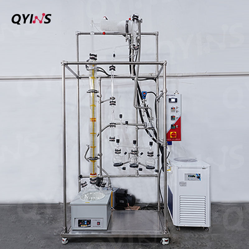 實驗型精餾塔,釜搭配磁力攪拌電熱套,塔柱為三層玻璃電加熱保溫,電磁鐵選用夾套形式,通制冷介質可有效避免因回流比設置過小電磁鐵發熱的情況,搭配油泵整機真空可達10pa 以內,適用于多種物料實驗。